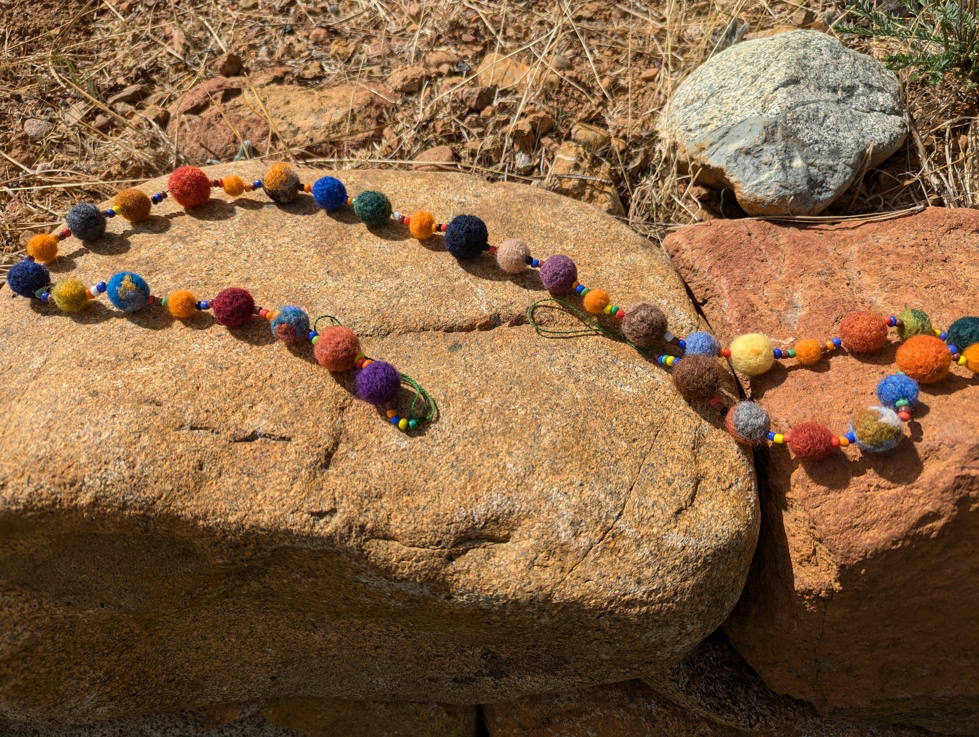 Needle felted woolen beads combine with small multi-colored beads to make a fun decorative garland. Complete with hanging loops, perfect for decorating your home.