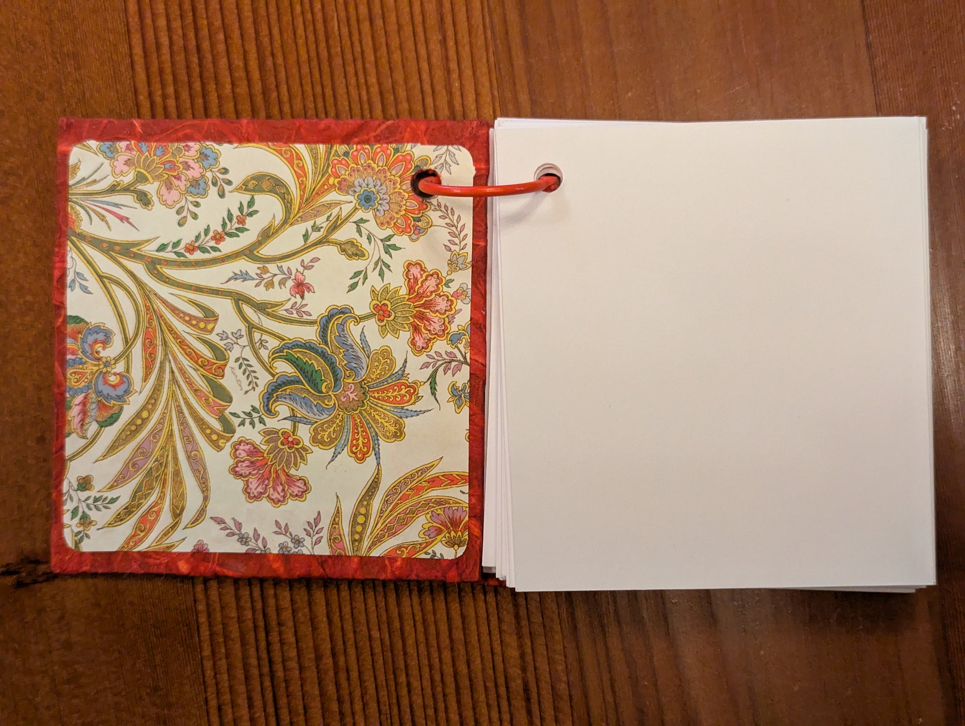 Handmade notepad with white paper pages. The red binder ring in the corner makes it easy to use at a moments notice. Great for jotting down thoughts and daily sketches, this notepad is a must-have. 3.75"x4"x0.75" copyright Hopscotch Fia