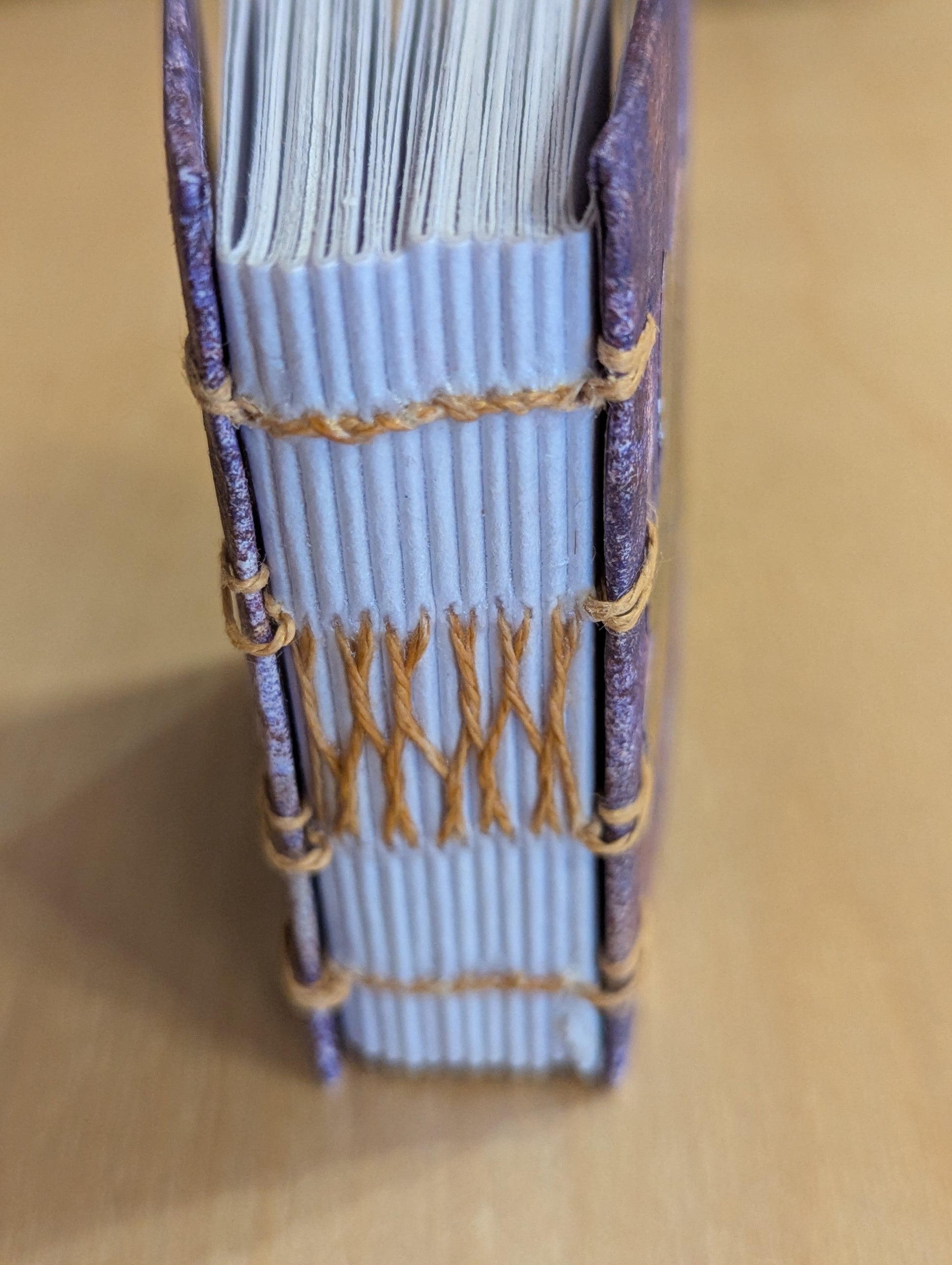 Hand bound journal covered with hand printed paper. The paper is thick, and light lavender colored, adding charm to every note and sketch.