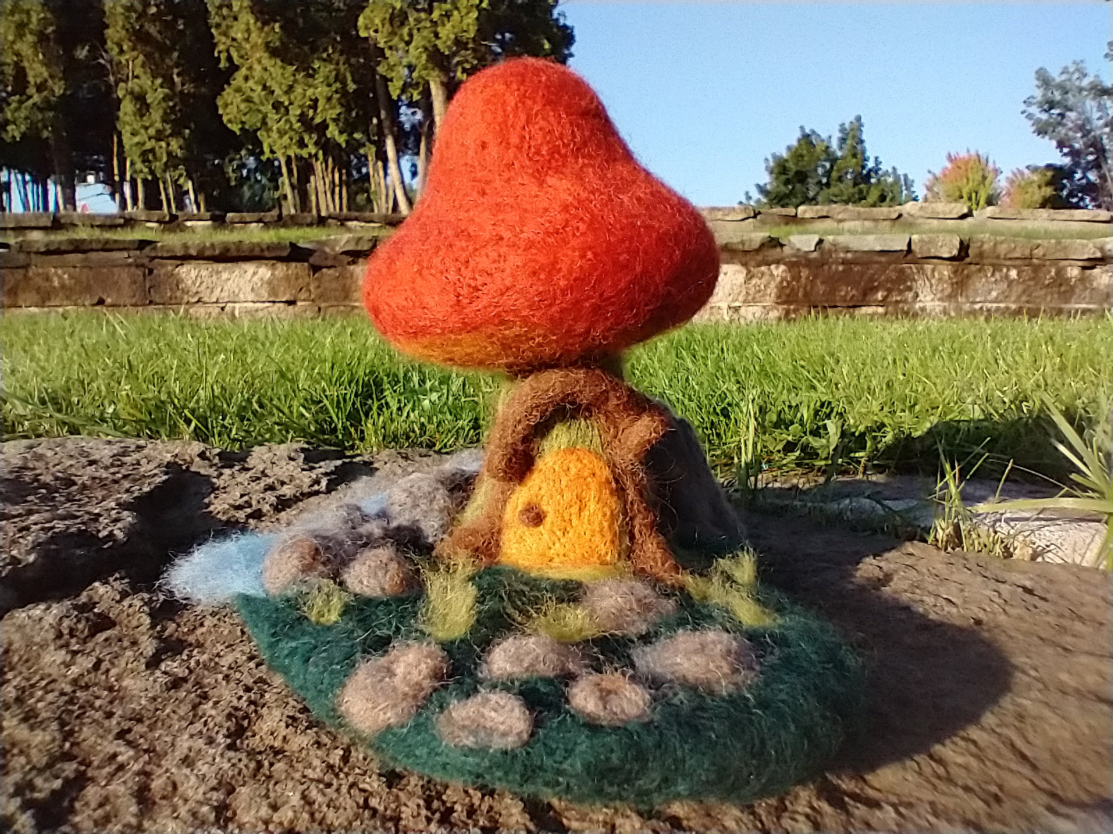 The gurgle of water against rocks and the smell of moss greets you as you discover this sweet scene nestled in the forest. Escape into a different world as you imagine life in a mushroom home complete with an arched wooden entrance and private creek. Perfectly sized to enhance any shelf or tabletop.