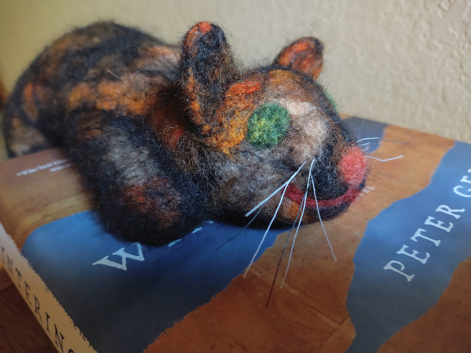 Margot is a needle felted cat made from wool roving. She's quite content to spend her time laying on your favorite book, and warming your heart.