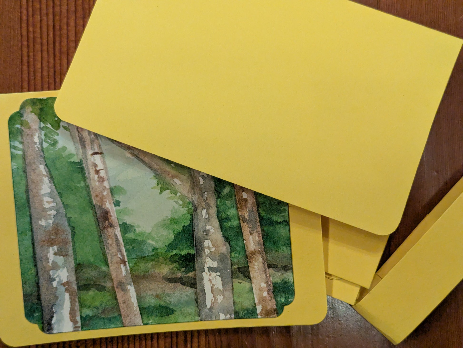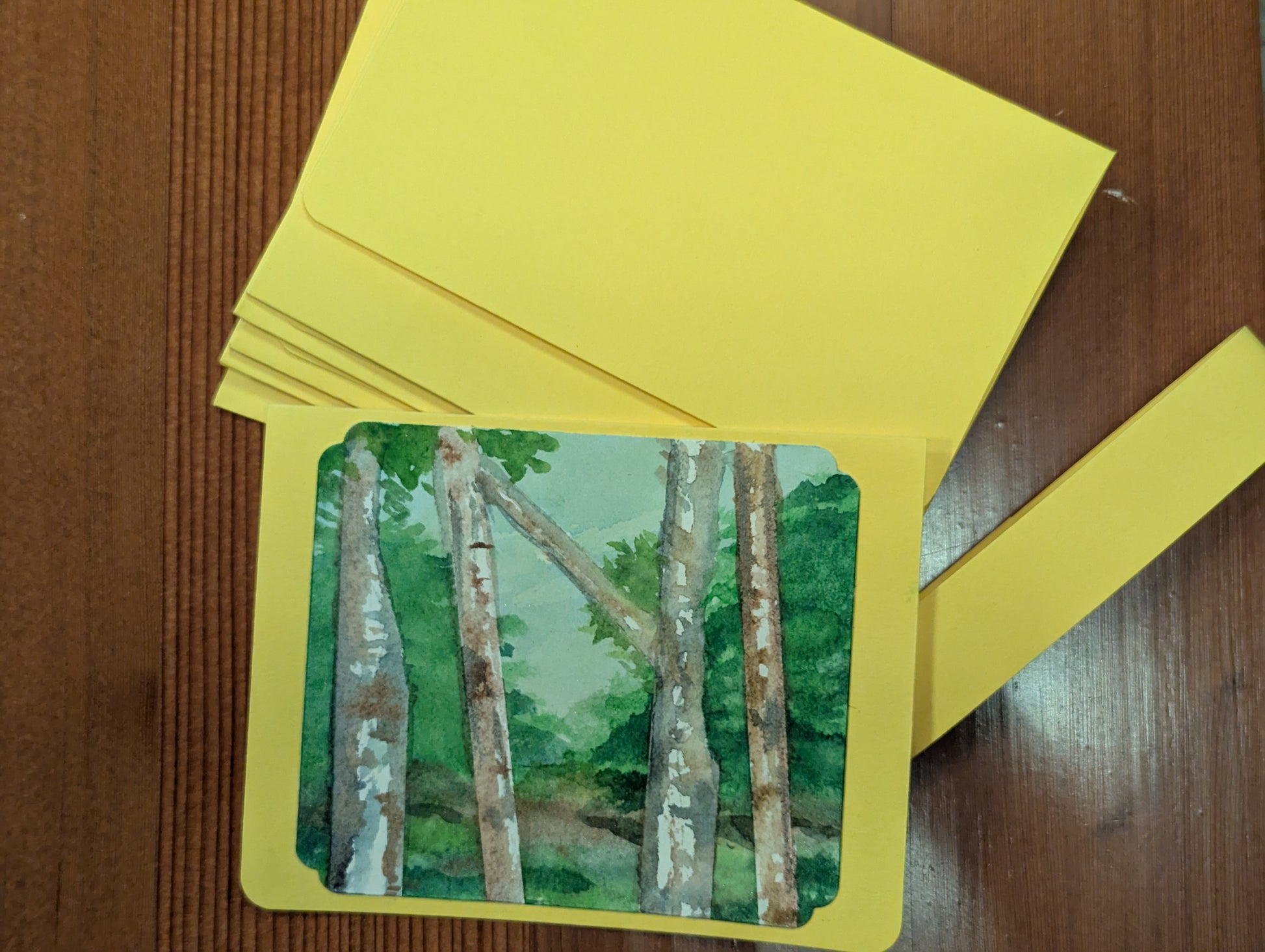 Handmade cards and envelopes. Hand painted scene of Aspen trees, blank inside, set of 5.
