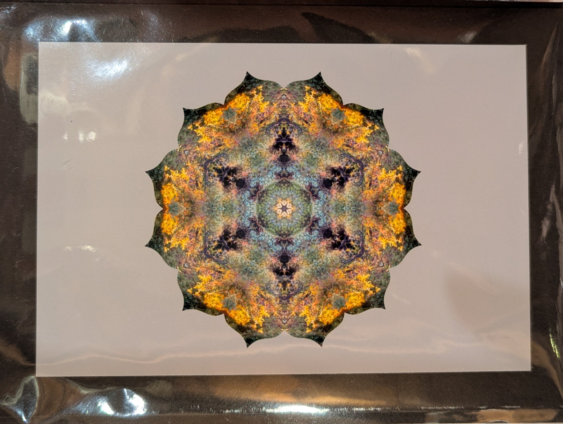 Greeting Card featuring the photographic work of a local artist. These mandalas are created from photos of natural objects designed into a pattern to invoke thoughtfulness and reflection.