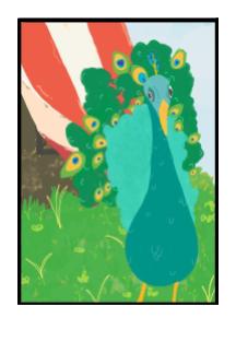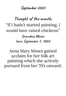 This month features a fanciful drawing of a peacock at a circus and a short tidbit about Grandma Moses.