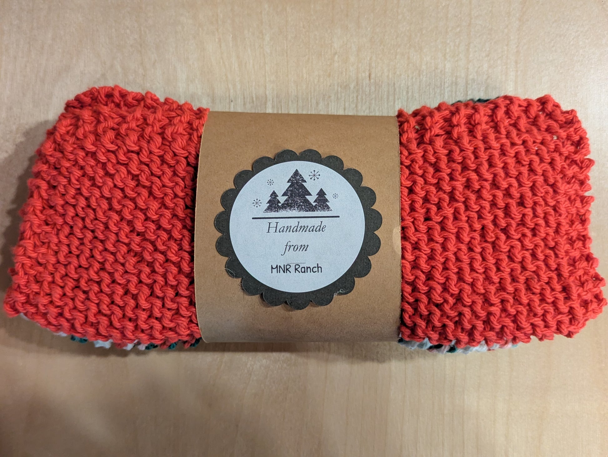 Hand knit dishclothes. Red, green and a variagated red/green/white washclothes, perfect for dishes. These will add cheer to your holiday home. They are also so giftable!