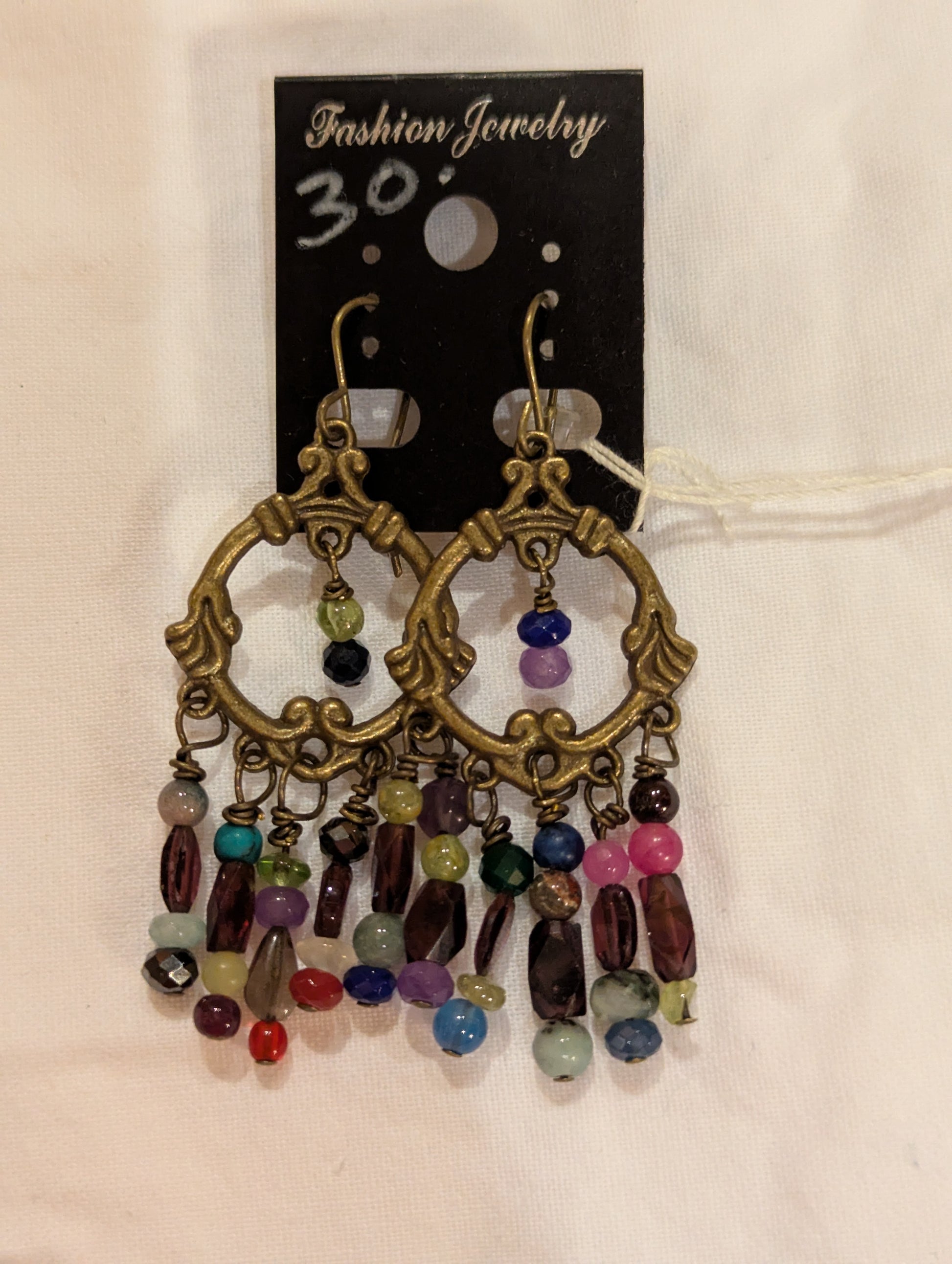 Drop earrings with hook. Bronze tone hoops with jewel tone Swarovski crystal and glass beads.