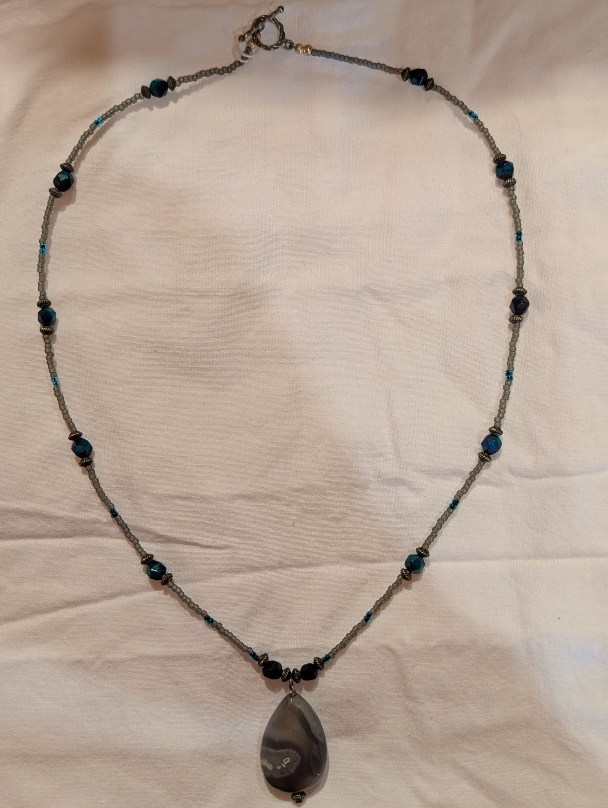 Beaded necklace in tones of grey and blue featuring a champagne agate stone pendant.