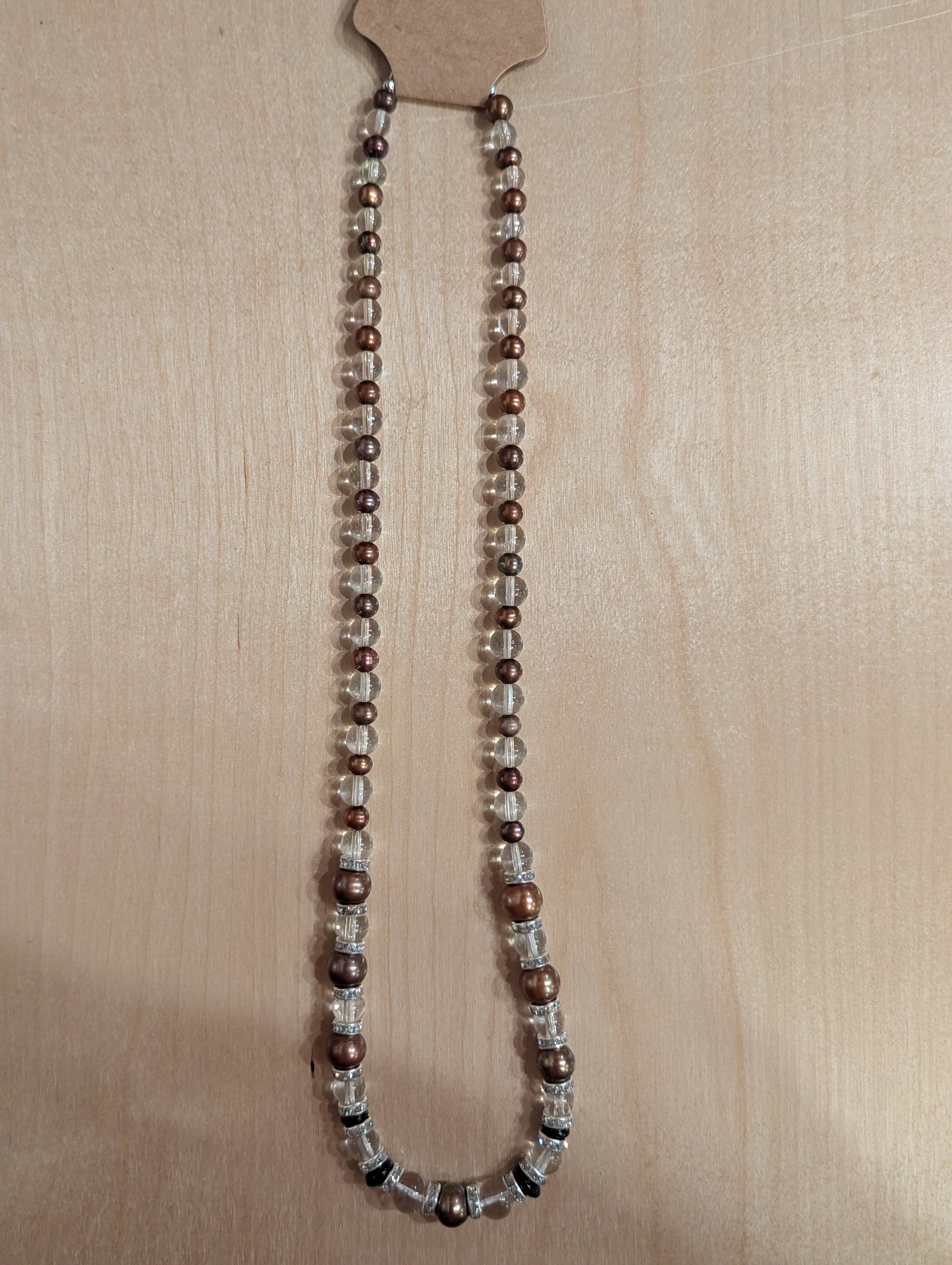 Hand made necklace. This single strand necklace brings to mind flickering firelight and a dazzling night sky. Bronze and clear glass beads are accented with black beads and crystal encrusted golden beads.