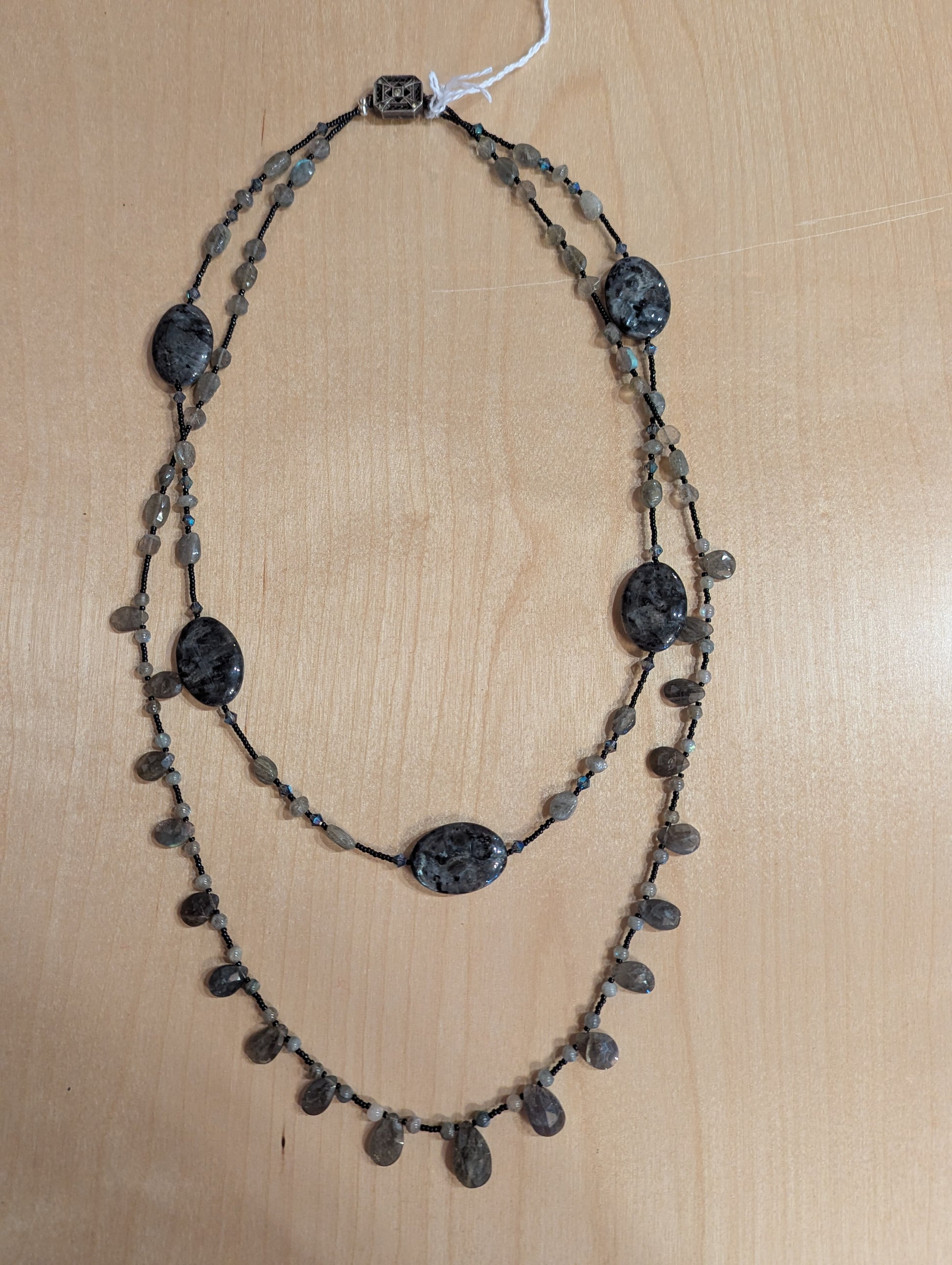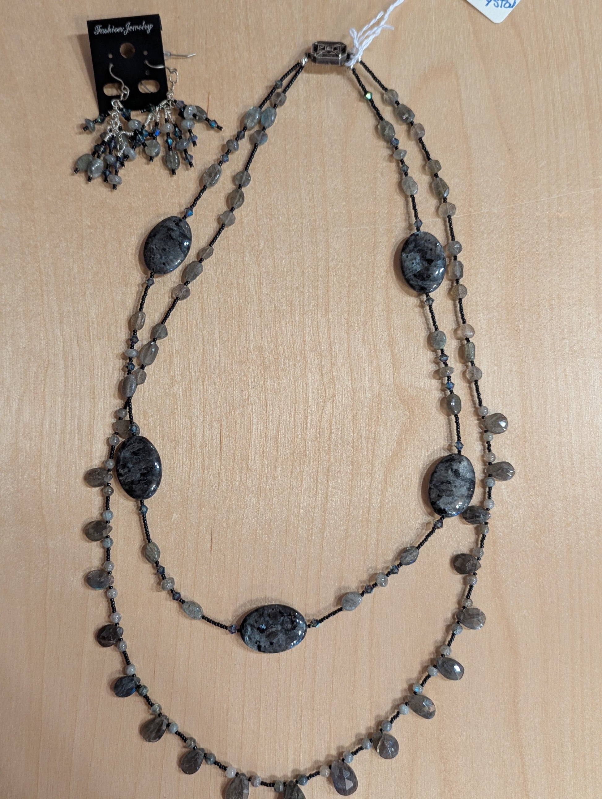 Hand made necklace and earring set. A rich pairing of Labradorite and Crystal brought together in a double strand necklace and matching cluster earrings.