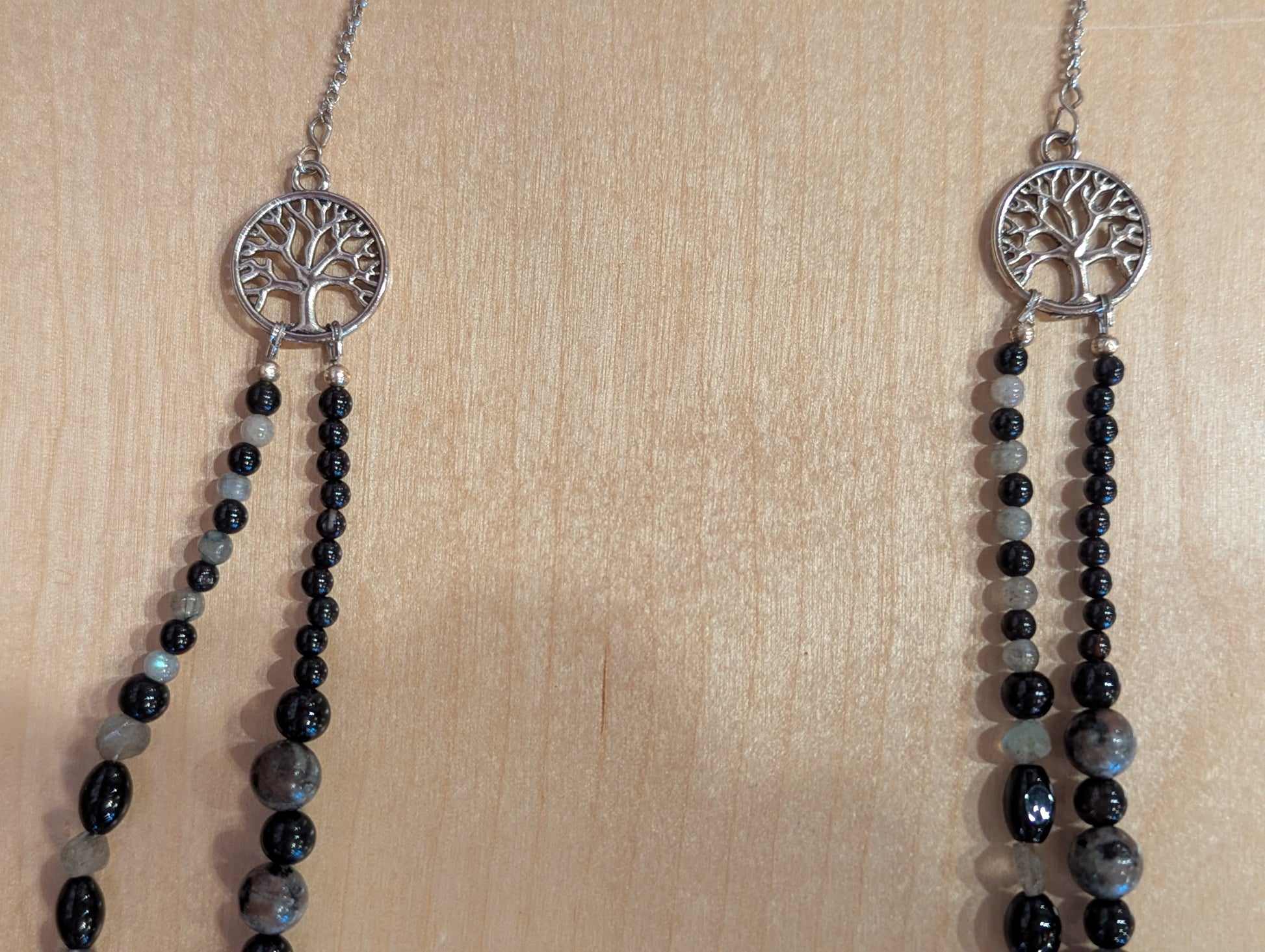 Hand made necklace featuring two strands of natural stone and decorative tree of life and leaf charms. A statement length piece, it is sure to be the focal point of your outfit!